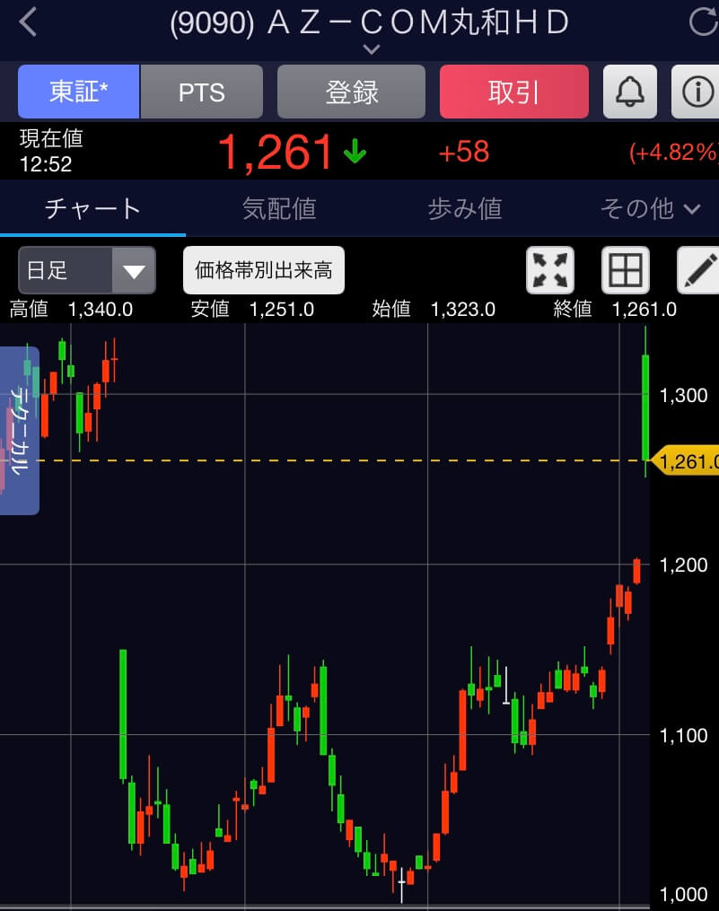 9時5分に一気に1340円まで上がって一瞬で1200円台後半まで下がっていました。